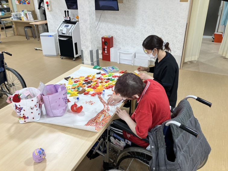 メディケアデイナゴミでも、この秋ならではの季節感を感じていただこうと今月は「秋」をテーマにした壁画づくりに取り組みました。