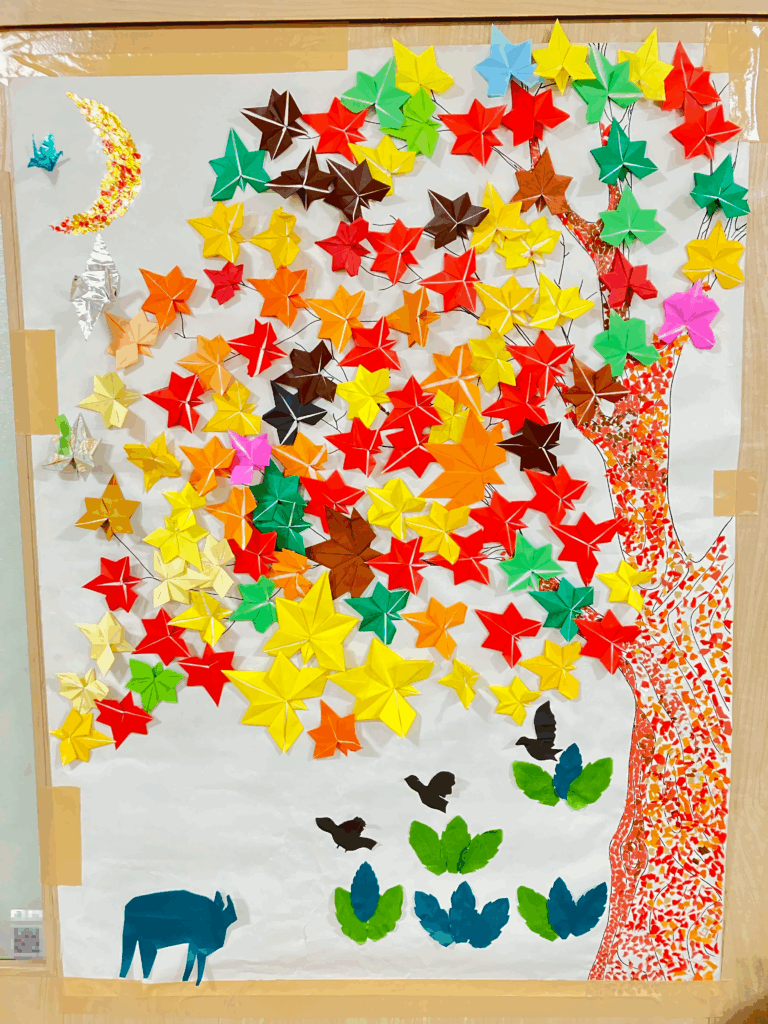 一枚一枚の葉っぱが、まるで本物のように表情豊かに仕上がり机の上が赤やオレンジ黄色の紙でいっぱいに染まりました。